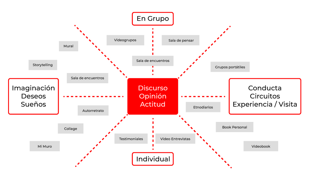 | Grupos y entrevistas de base | Dispositivos avanzados | Etnografía | Innovación y Desarrollo | On Road |
